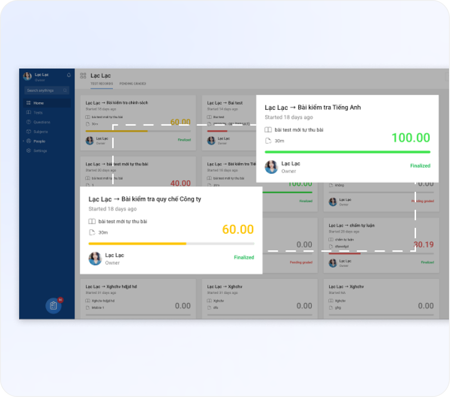 Thống kê kết quả theo bài kiểm tra, nhóm, chủ đề để người quản lý có góc nhìn toàn diện